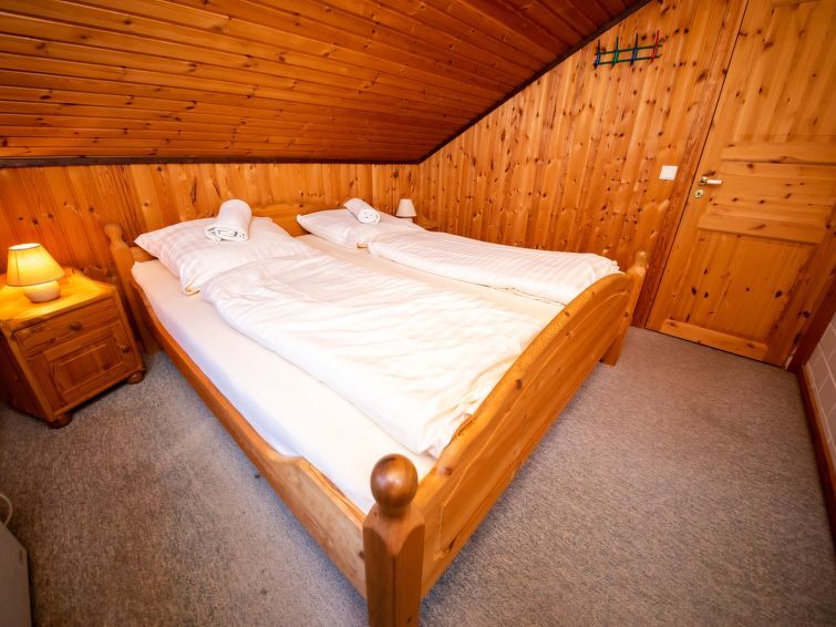 "Haus am Wald", maison jumelée 4 pièces 70 m2 sur 2 niveaux, au rez-de-chaussée. Aménagement plaisant: séjour/chambre à coucher avec 1 divan-lit double (160 cm, longueur 200 cm), poêle suédois, TV (satellite), radio et lecteur CD. Sortie sur le jardin, sur la terrasse. Coin cuisine (4 plaques de cuisson, four, lave-vaisselle, micro-ondes, cafetière électrique). Bain/douche/WC. À l'étage supérieur: 1 chambre, mansardée, sans armoire avec 1 lit (90 cm, longueur 190 cm). 1 chambre, mansardée, sans armoire avec 1 lit double (180 cm, longueur 200 cm). Chauffage électrique. Petit jardin. Meubles de terrasse, barbecue électrique (portable). A disposition: sauna, chaise haute pour enfant, lit bébé jusqu'à 2 ans, bois (en sus). Internet (Connexion WIFI, gratuit). Veuillez noter: maison non-fumeur. Maximum 2 animaux/ chiens autorisés. La penderie commune aux chambres simple et double se trouve dans le petit couloir à l'étage. Salon / salle à manger avec chauffage au sol. Salle de bain avec chauffage au sol et accès au sauna. Accès à la maison de vacances située directement en lisière de forêt par un escalier extérieur avec rampe pour vélos et bagages. 1 place de parking réservée en amont de la maison (devant l'escalier extérieur).
