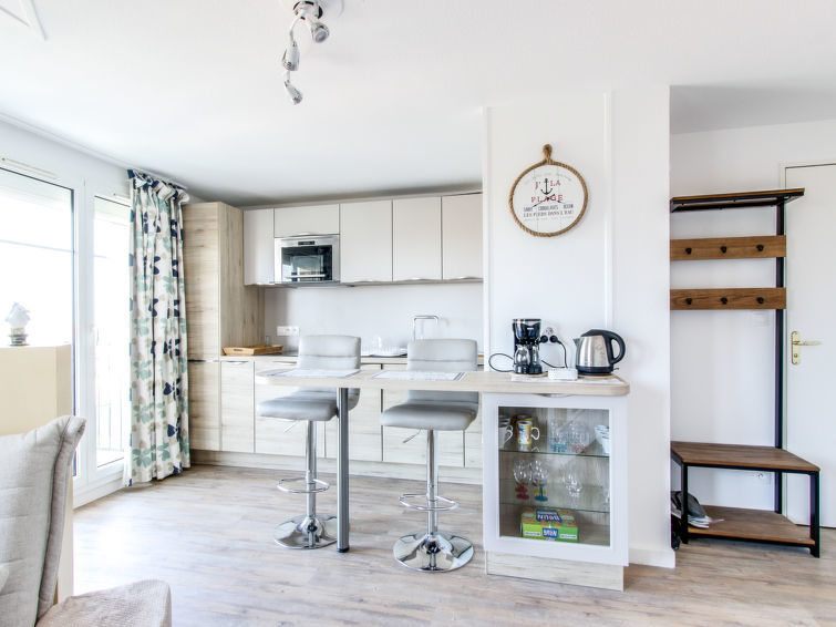 Appartement 2-kamers 35 m2 op 2 verdiepingen op de 2e verdieping, op het noordwesten gelegen. Woon-/eetkamer met TV (Flatscreen TV), elektrische rolluiken. Uitgang naar het balkon. Kookhoek (afwasmachine, 3 inductiekookplaten, broodrooster, waterkoker, magnetron, diepvriezer, elektrische koffiemachine) met bar. Aparte WC. Elektrische verwarming. Bovenverdieping: 1 kamer met 1 2-pers bed (140 cm, lengte 190 cm). Douche/WC. Parketvloeren. Balkon 5 m2. Balkonmeubilair. Mooi uitzicht in de verte op zee en de rivier. Ter beschikking: haardroger. Internet (Internet (WiFi), extra). Parkeerplaats nr. 2831. Rookmelders.