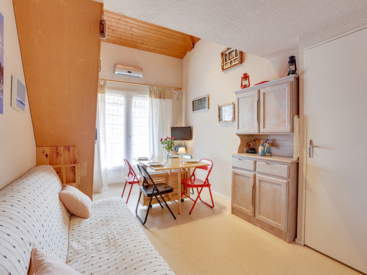 Maisonette 2-kamers 32 m2 op de 2e verdieping. Woon-/eetkamer met TV (Flatscreen TV). Uitgang naar het terras. 1 kamer met 1 2-pers bed (1 x 140 cm, lengte 190 cm). Kookhoek (2-pits kookplaat, magnetron, elektrische koffiemachine). Douche, aparte WC. Elektrische verwarming. Bovenverdieping: open galerij met afgeschuinde daken met 2 bedden (80 cm, lengte 190 cm). Terras 9 m2. Terrasmeubelen. Uitzicht op het zwembad. Ter beschikking: Internet (WiFi, extra). Rookmelders. In plaats van een afgesloten slaapkamer bevinden sommige slaapgedeeltes zich in een open ruimte (galerij, nis, etc.).